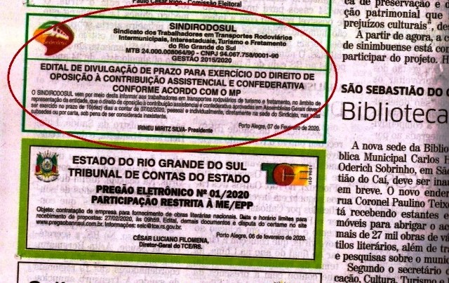 O Sindirodosul publicou nesta sexta-feira, dia 07 de fevereiro, edital no jornal Correio do Povo, de circulação em todo o Rio Grande do Sul, anunciando o prazo de dez dias, a contar desta data, para os trabalhadores das empresas de fretamento e turismo fazerem a oposição à contribuição assistencial e confederativa aprovada em assembleia da categoria profissional.