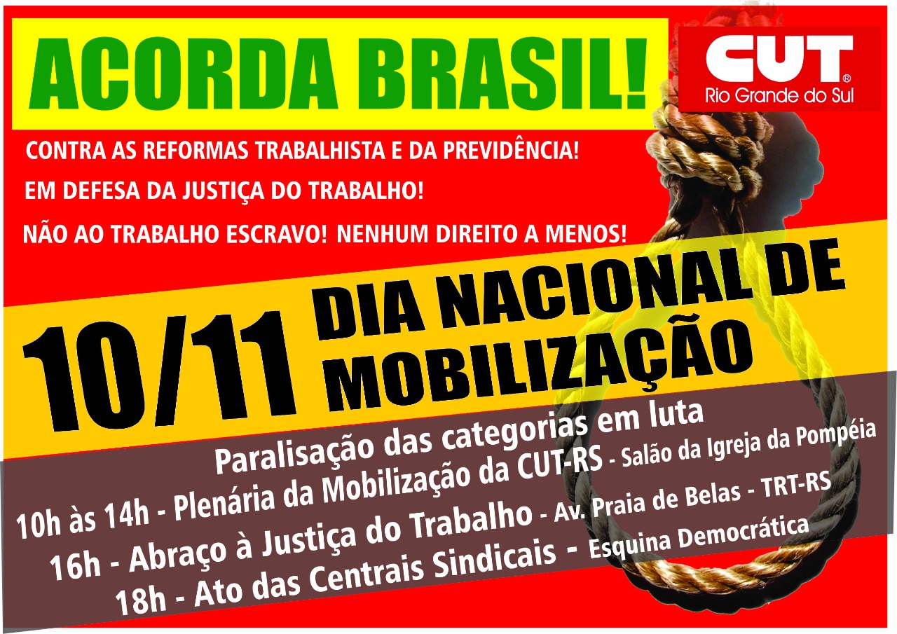 Às vésperas do início da vigência em 11 de novembro da lei 13.467, a chamada “reforma” trabalhista, e diante da ameaça de votação da “reforma” da Previdência, a CUT-RS está organizando as entidades filiadas para o Dia Nacional de Mobilização que ocorrerá na próxima sexta-feira (10). Pela manhã, haverá paralisação das categorias em luta e uma plenária extraordinária de mobilização da CUT-RS, das 10h às 14h, no salão da igreja da Pompeia, em Porto Alegre.