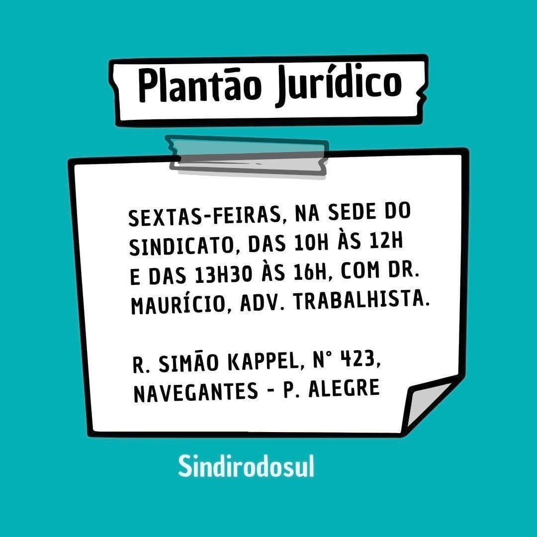 O advogado trabalhista, dr. Maurício Vieira, atende no plantão jurídico das 10h às 12 e das 14h às 16h30, na sede do Sindirodosul, à Rua Simão Kappel, 423, bairro Navegantes, em Porto Alegre, próximo à Estação Farrapos do Trensurb.