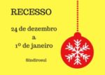 Informamos que, devido aos feriados de Natal e Fim de Ano, o Sindirodosul fará recesso e não haverá atendimento na sede entre os dias 24 de dezembro, segunda-feira, e 1° de janeiro, terça-feira.